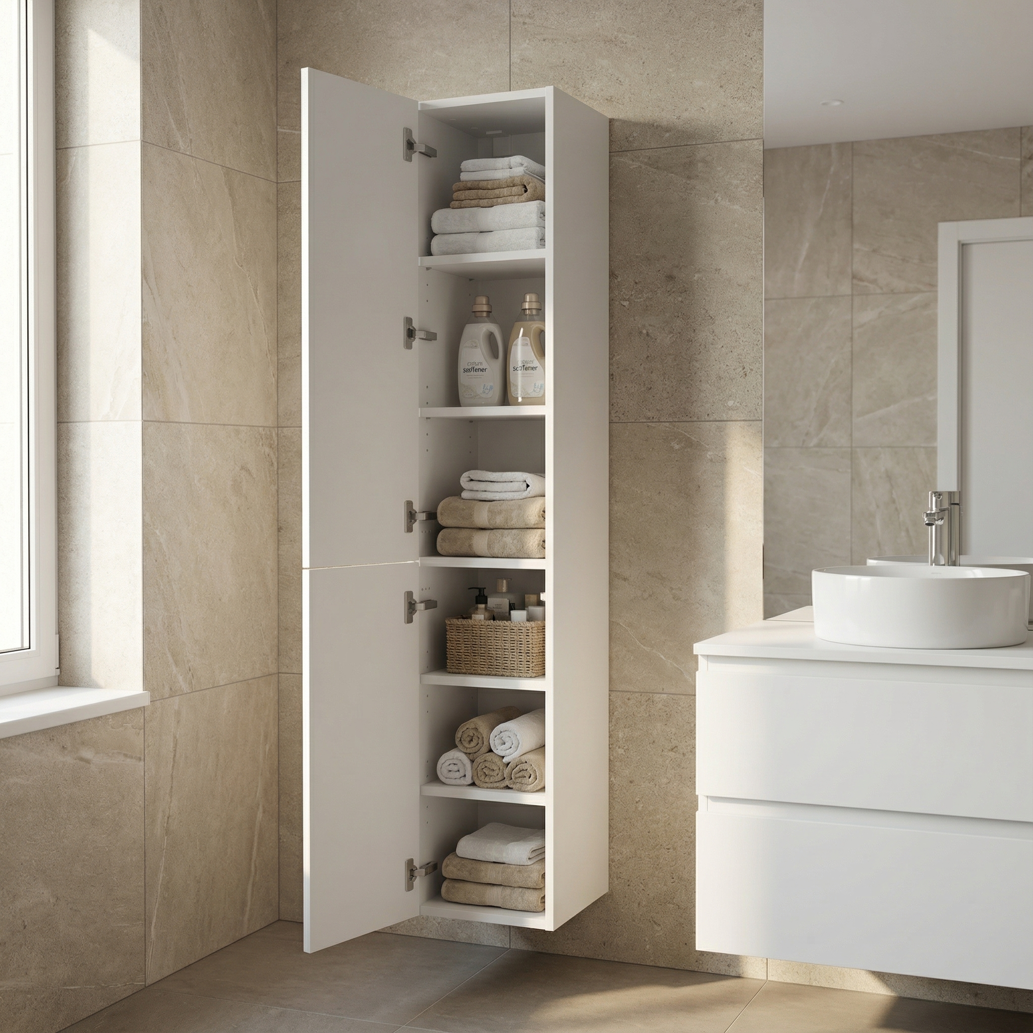 PRO Vysoká dverová skrinka je skvelým riešením pre organizáciu a uskladnenie vašich kúpeľňových potrieb. Vďaka jej vertikálnemu dizajnu nevyžaduje veľa miesta, čím je ideálna aj do menších priestorov. Umožňuje pohodlné uskladnenie uterákov, čistiacich prostriedkov a ďalších nevyhnutností. Zásluhou kvalitného kovania Blum sa skriňa otvára s minimálnym úsilím a bez hluku, čo zvyšuje komfort jej používania.