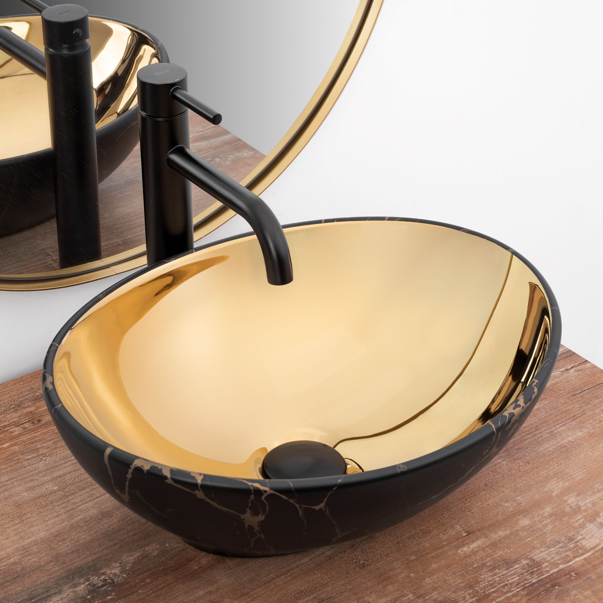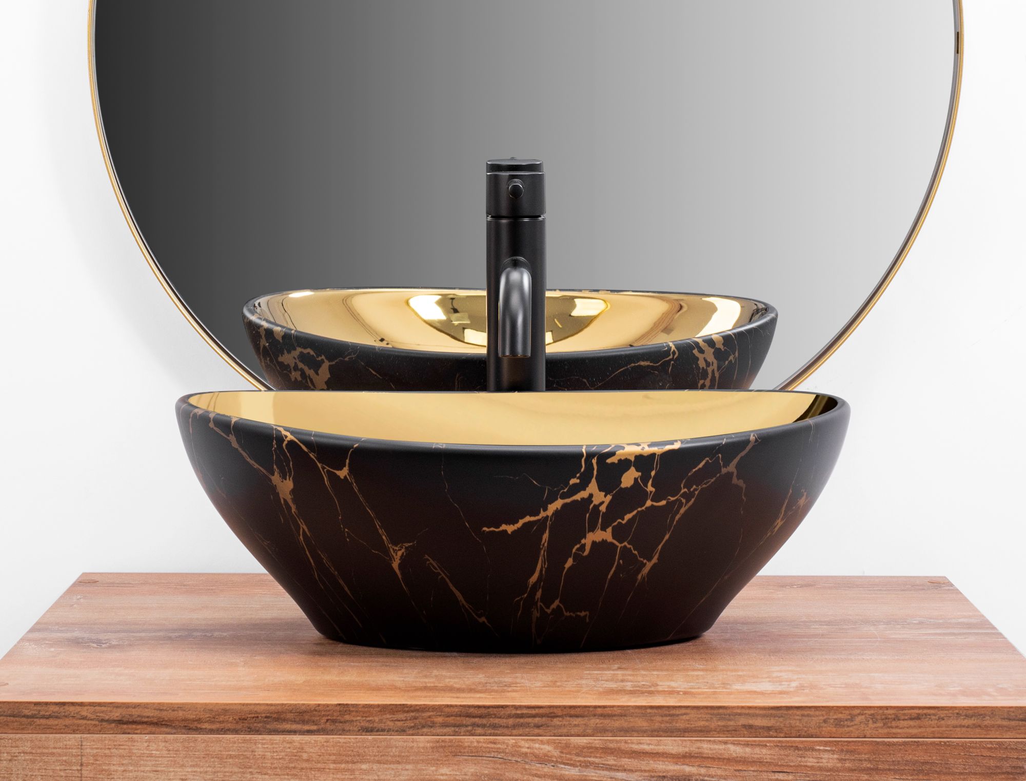 Umývadlo v čiernom lesklom prevedení na vnútornej strane a zlatom lesklom prevedení na vonkajšej strane sa navyše vďaka špeciálnej fáze výroby ľahko čistí a je veľmi odolné.