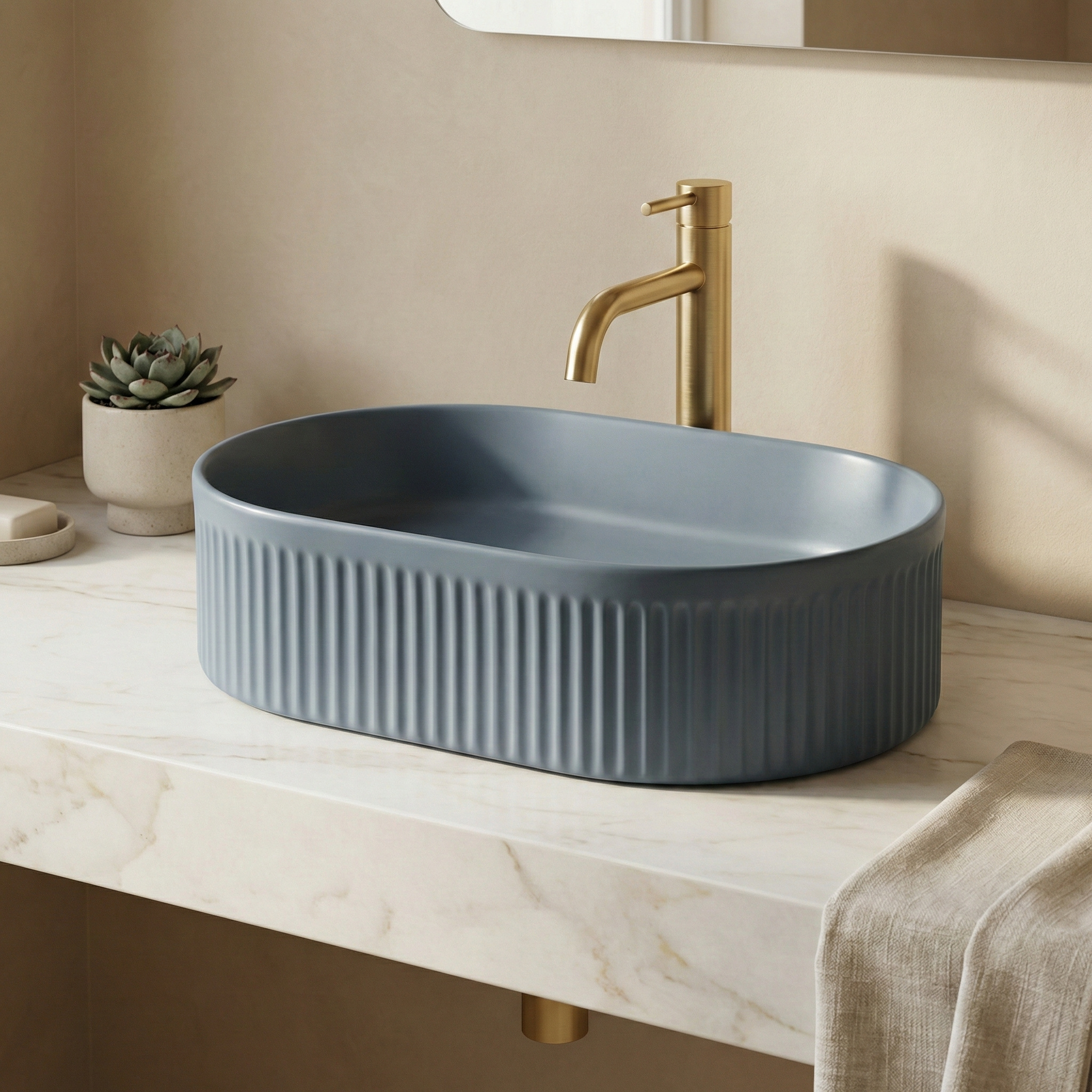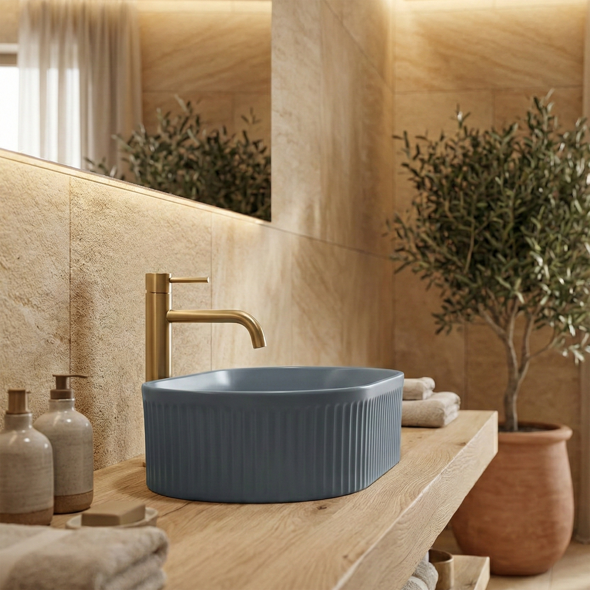 Chcete do svojej kúpeľne vniesť trochu farby a najnovšie trendy? Objavte umývadlo na dosku Rea Vanda v jedinečnom vyhotovení Blueberry Matt. Ide o ideálne spojenie moderného dizajnu a jemnej elegancie. Charakteristické ryhovanie na vonkajšom povrchu vytvára zaujímavý vizuálny efekt a kvalitná sanitárna keramika zabezpečuje komfort pri používaní. Farba Blueberry Matt – hlboký „berry“ odtieň v matnom vyhotovení, ktorý dodáva interiéru sviežosť a originalitu. Ryhovaný vonkajší povrch – vertikálne drážky vytvárajú jedinečný trojrozmerný efekt a zvýrazňujú moderný dizajn umývadla. Vysokokvalitná sanitárna keramika – zaručuje odolnosť pri každodennom používaní a jednoduchú údržbu. Montáž na dosku – umývadlo je určené na postavenie na dosku, čo umožňuje plne vyniknúť jeho dekoratívnej forme. Oválny tvar – elegantná a praktická forma vhodná do mnohých kúpeľňových interiérov. Bez otvoru pre batériu – určené pre vysoké stojanové alebo podomietkové (nástenné) batérie. Bez prepadového otvoru – podčiarkuje minimalistický a hladký dizajn vnútornej misy, zabezpečuje dokonale hladký povrch. Umývadlo na dosku Rea Vanda Blueberry Matt je skvelou voľbou pre tých, ktorí oceňujú netradičné riešenia a chcú zo svojej kúpeľne urobiť štýlový priestor. Ryhovaná textúra v kombinácii s módnou matnou farbou robí z umývadla centrálny prvok každej modernej kúpeľne.