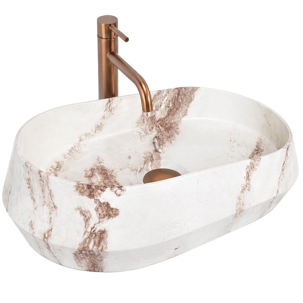 Moderná nízka umývadlová batéria série Rea Orbit je vyrobená z vysoko kvalitnej mosadze s úpravou v nevšednom bielom matnom prevedení so zlatým madlom.